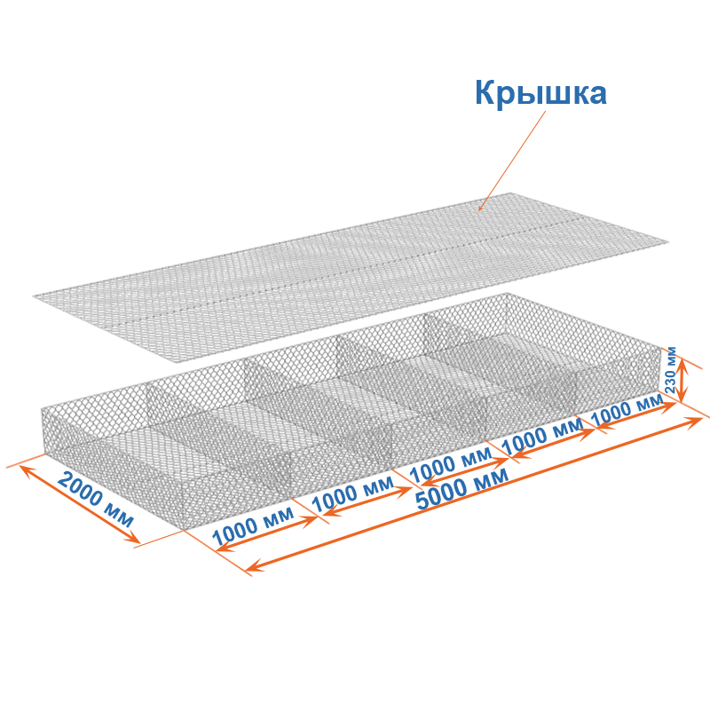 Пример применения: укрепление откосов и русел на типовых участках; заполнение камнем фракции крупнее 60х80, фиксация крышек и кромок после выверки отметок.
