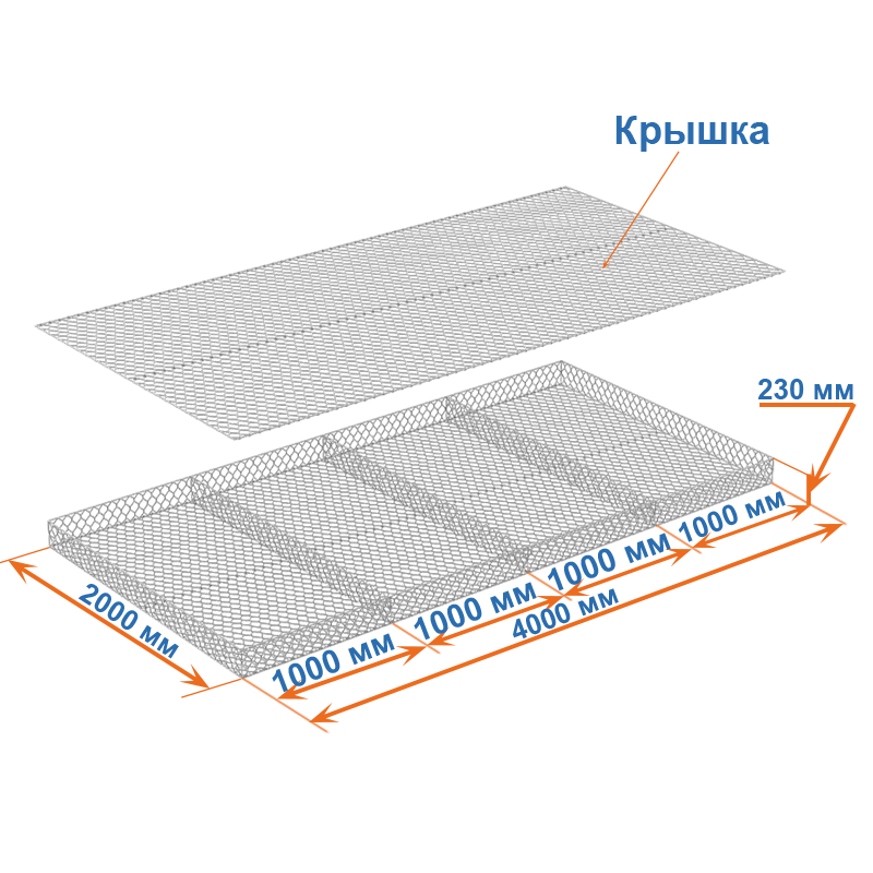 Матрасы Рено 4x2x0,23 — плоские габионные секции из сетки двойного кручения с ячейкой 60х80, проволокой 2,2 мм и покрытием Цинк.
